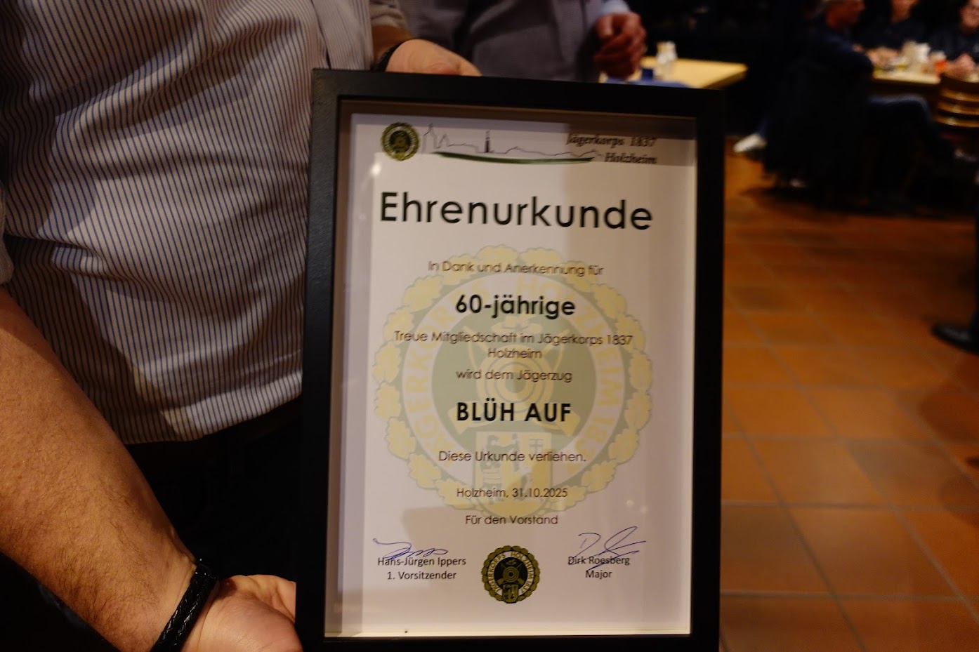 Unter Top 9 der Tagesordnung erfolgten die Ehrungen der Jubilare sowie die Auszeichnungen der Sieger bei den Schießwettbewerben. Neuer Korpskönig ist Willi Roesberg, der am 20. September beim Jägerbiwak mit dem 197 Schuss den Vogel abschoss. Major Dirk Roesberg bedanke sich auch bei den ausscheidenden Vorstandsmitgliedern und überreichte jedem eine Erinnerung (Karikatur des Jägers und Holzheimer Künstlers Theo Segger). Nachdem unter Punkt Verschiedenes noch einige Termine bekannt gegeben wurden, konnte eine gut besuchte Mitgliederversammlung beendet werden.