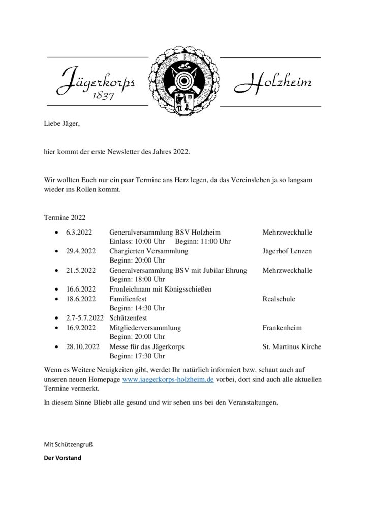 Unter Top 9 der Tagesordnung erfolgten die Ehrungen der Jubilare sowie die Auszeichnungen der Sieger bei den Schießwettbewerben. Neuer Korpskönig ist Willi Roesberg, der am 20. September beim Jägerbiwak mit dem 197 Schuss den Vogel abschoss. Major Dirk Roesberg bedanke sich auch bei den ausscheidenden Vorstandsmitgliedern und überreichte jedem eine Erinnerung (Karikatur des Jägers und Holzheimer Künstlers Theo Segger). Nachdem unter Punkt Verschiedenes noch einige Termine bekannt gegeben wurden, konnte eine gut besuchte Mitgliederversammlung beendet werden.